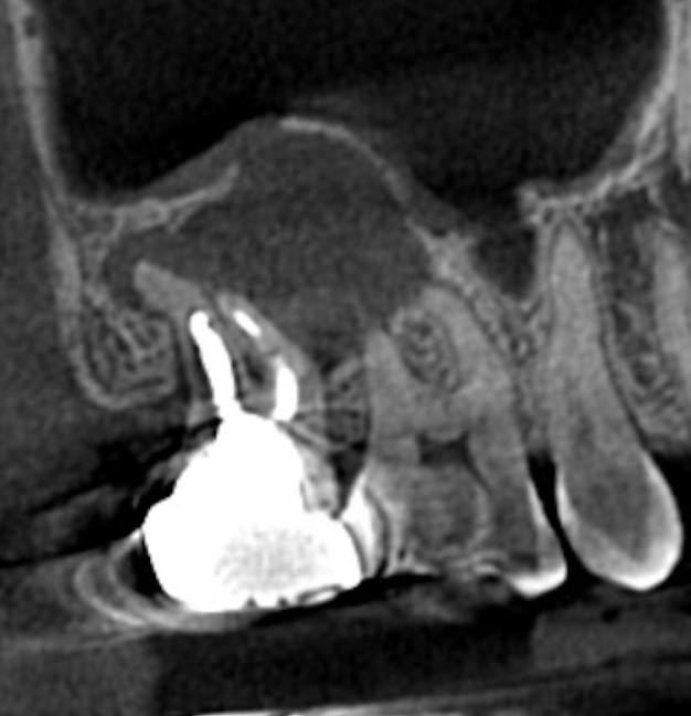 根尖部に上顎洞に達する大きな透過像(病変)を認めました。